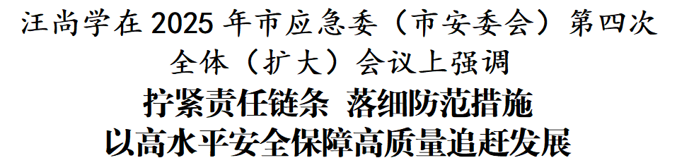汪尚学指出,今年以来,全市上下坚持把统筹发展和安全摆在突出位置,以“社会治理比安全看稳定”行动为抓手,全力以赴防风险、除隐患、遏事故、保安全,责任体系更加完善,排查整治不断深入,抢险救灾及时高效,基层基础持续夯实,安全生产形势总体稳定。要持续提高思想认识,牢固树立源头治理、系统治理思维,紧盯问题短板,深入开展隐患清零整治、主体责任体检、执法监管增效、全民宣教培训行动,推动整体安全水平不断提升。