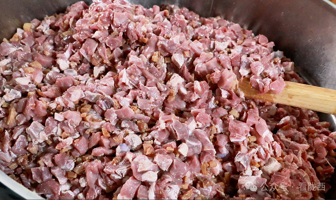 肉臊子用的是农家土猪,二百斤往上,前腿附近的前夹子肉,一指半的膘最合适。肥瘦分开,切成拇指肚大小的肉粒,肥瘦比例二比三,精准得像做实验。一次炒二百斤,八十斤肥肉,一百二十斤瘦肉。二尺二的大锅,先下肥肉,大火猛攻四十分钟,待肥肉析出油脂、表面泛出金黄,再下瘦肉,大火再炒一小时。五成熟时转小火煨炖,每隔二十分钟翻一次,防止粘锅。再煨一个半小时,臊子软嫩熟透,最后加入四斤秘制调味料粉,一顿翻炒,出锅。这四斤料粉,是一锅臊子的灵魂——十三味调料,严格按比例配制:花椒必是陇南大红袍,姜皮不能带姜肉,大香不能带籽粒……连油泼辣子,也是各地辣椒面按比例混合的。新疆辣椒面的红艳,贵州辣椒面的中辣,陕西和甘谷辣椒面的浓香,在一斤辣椒面、两斤滚烫菜籽油的激荡下,“滋啦”一声,香气四溢。只有恰到好处的配伍,才能调出层次丰富、回味无穷的醇厚味道。而这,正是全城十三家王勇大肉面统一的味儿,也是你念念不忘的灵魂所在。