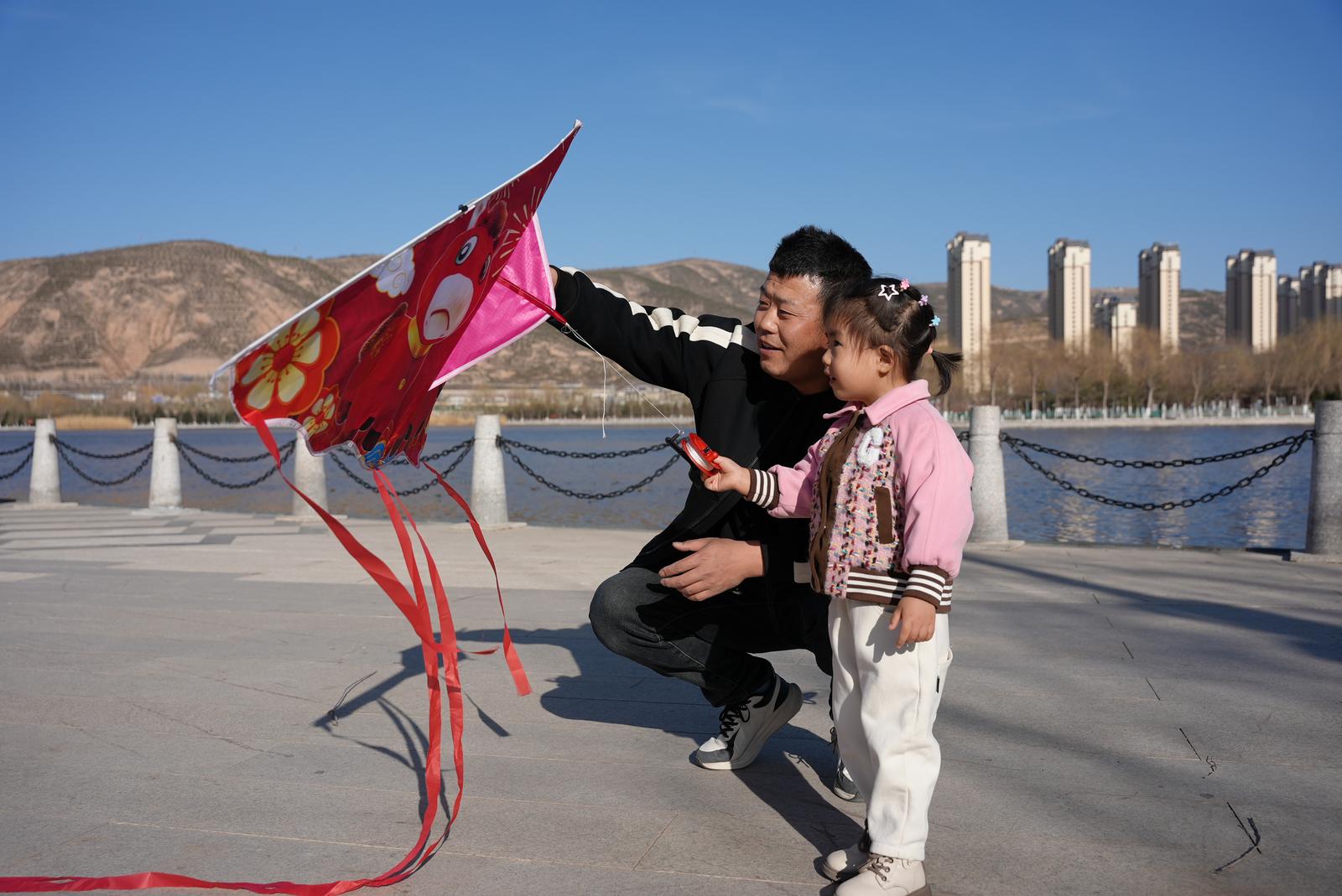 近日,在定西公园,不少家长带着孩子在广场上放风筝,尽情享受春日好时光。起跑、放线、牵引,一只只色彩鲜亮的风筝在湛蓝的天空中舒展摇曳,与澄澈湖水、城市楼宇相映成趣,绘就一幅生机盎然的春日画卷。