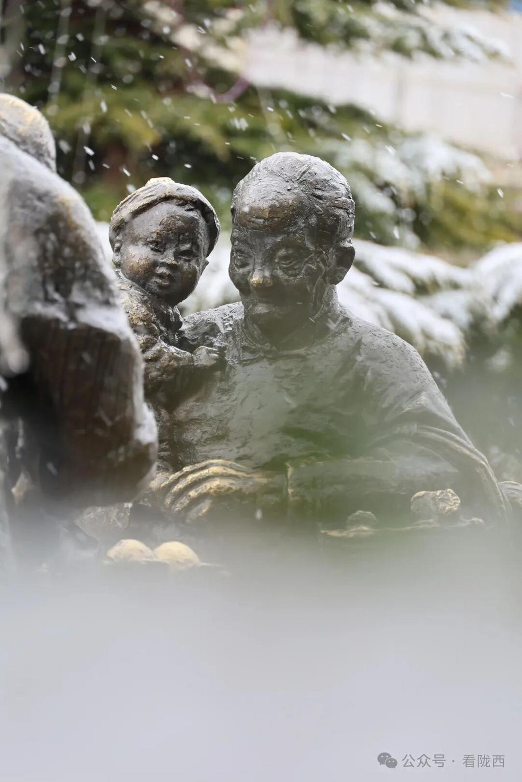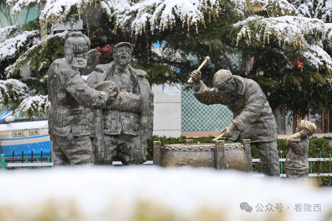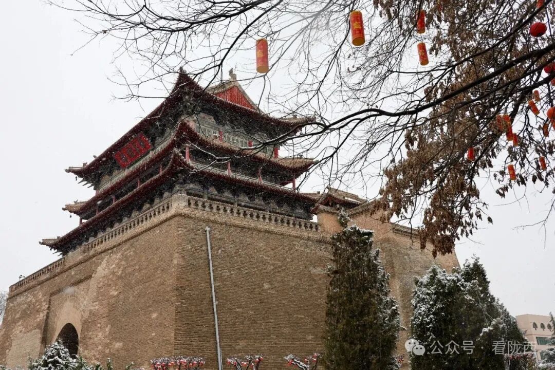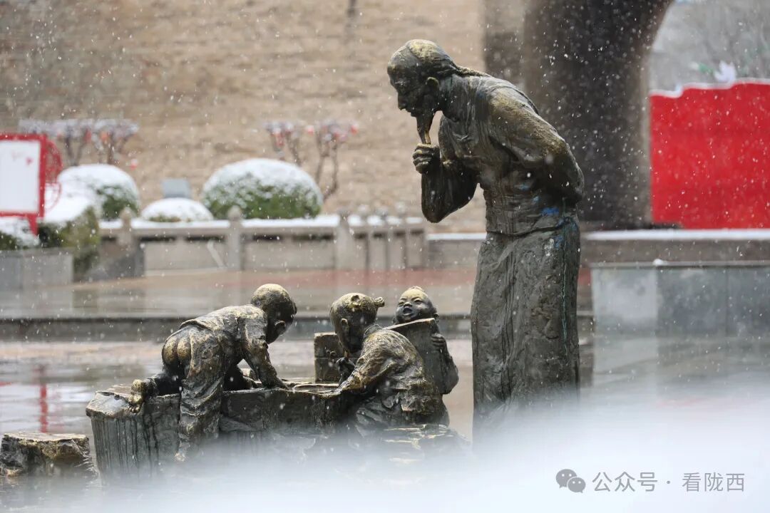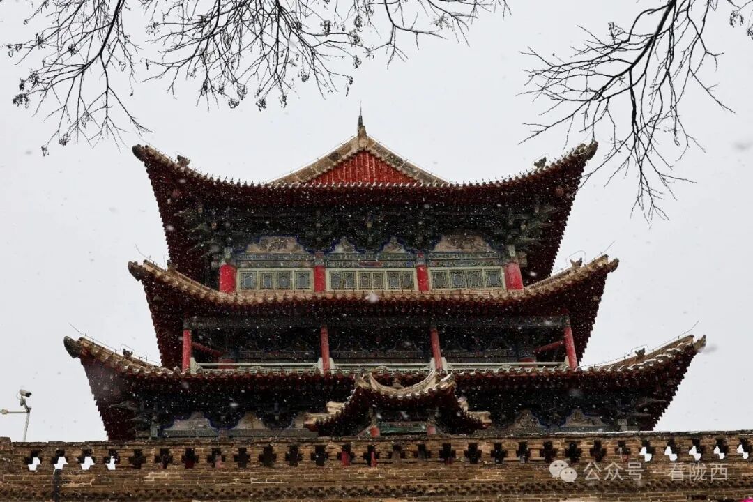 惊蛰时节,一场春雪不期而至。雄踞陇西县城中央的威远楼在漫天飞雪中静默伫立,翘脊覆白,飞檐凝霜,愈发显得古朴庄重、静谧安详。雪花轻柔飘落,将这千年古楼装点得如诗如画。威远楼广场上,云阳板、秧歌铰子等雕塑也被春雪轻覆,那些凝固了陇西人文记忆的雕像,在雪中仿佛被唤醒,将这片土地的千年气韵,衬得愈发动人。