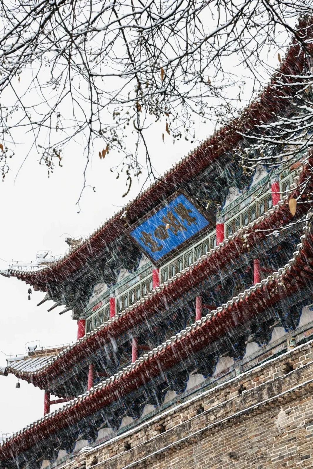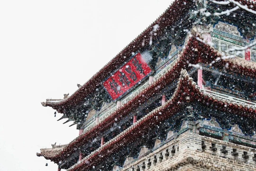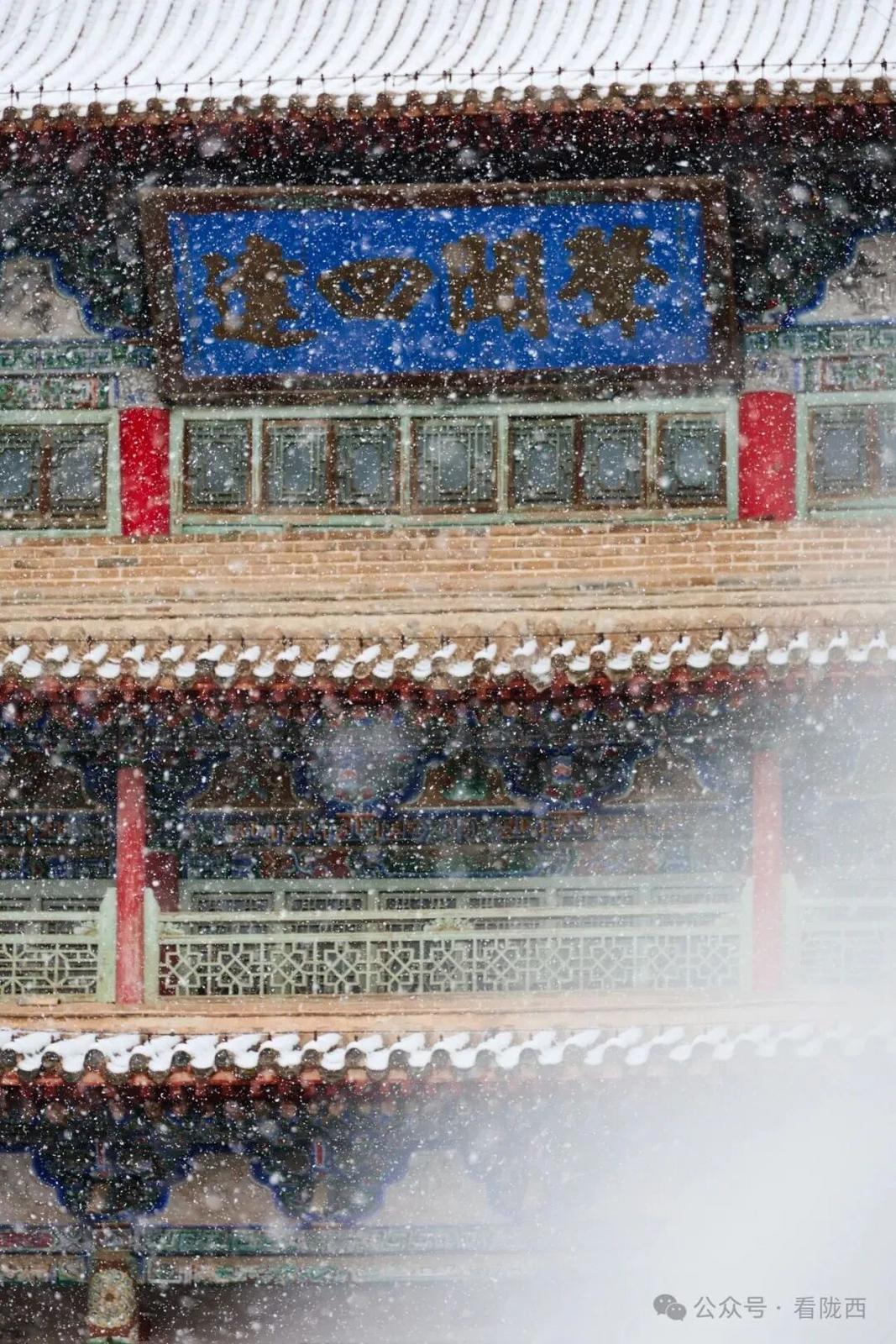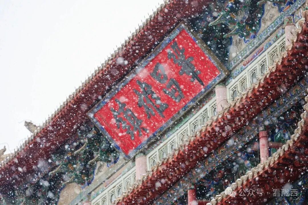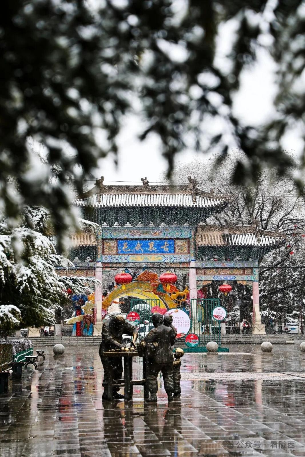 惊蛰时节,一场春雪不期而至。雄踞陇西县城中央的威远楼在漫天飞雪中静默伫立,翘脊覆白,飞檐凝霜,愈发显得古朴庄重、静谧安详。雪花轻柔飘落,将这千年古楼装点得如诗如画。威远楼广场上,云阳板、秧歌铰子等雕塑也被春雪轻覆,那些凝固了陇西人文记忆的雕像,在雪中仿佛被唤醒,将这片土地的千年气韵,衬得愈发动人。