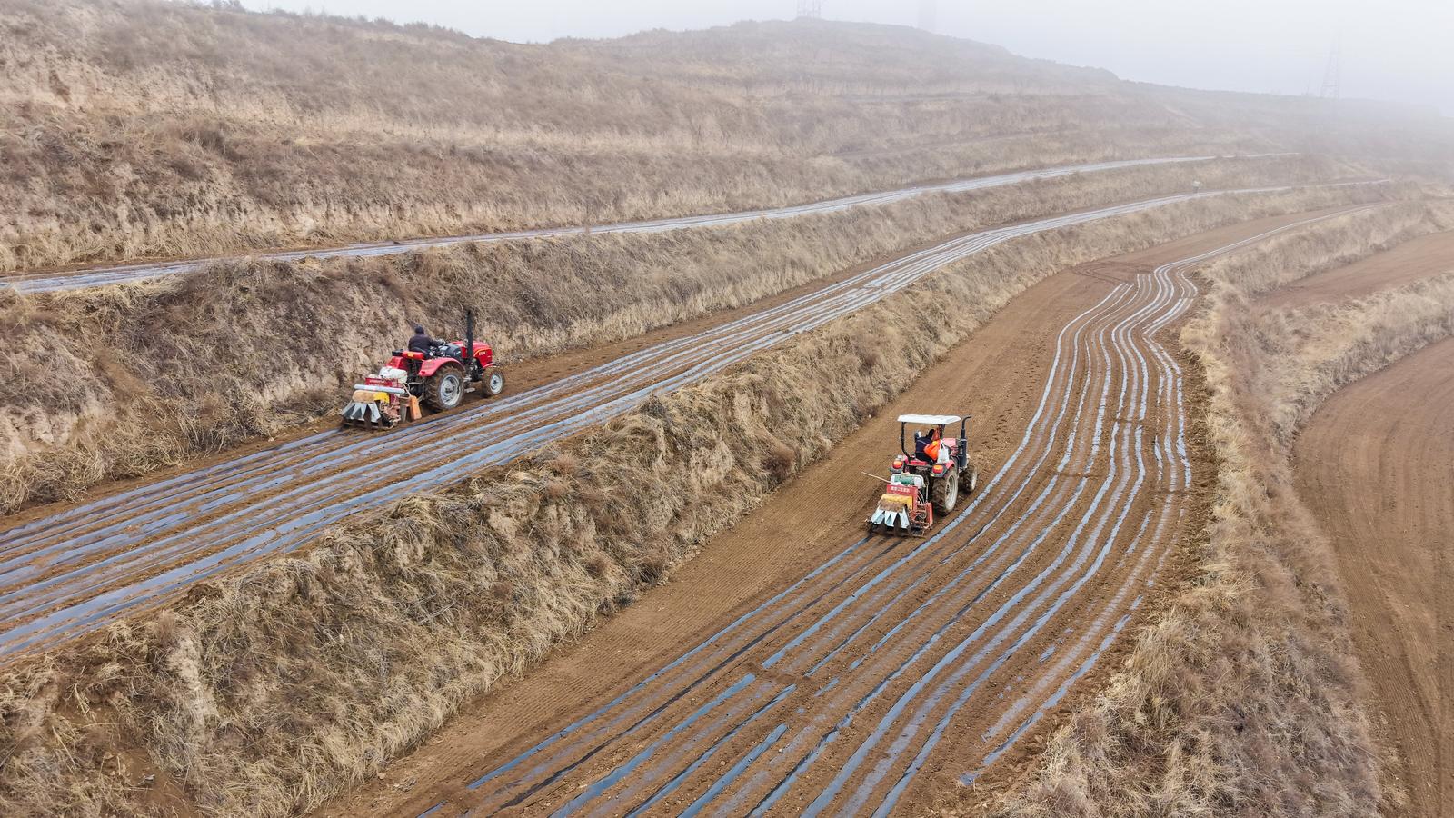 随着气温回暖,通渭县陇阳镇田间地头一派繁忙景象。今年,当地地膜补贴及时发放到位,群众种粮积极性高涨,抢抓土壤墒情,铺地膜、点籽种,在这片旱塬上织起了银色的“春装”。