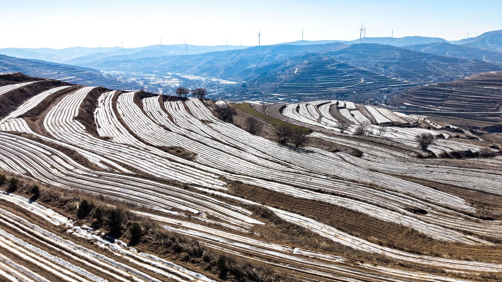 漫山梯田被银膜覆盖,阳光下波光粼粼。