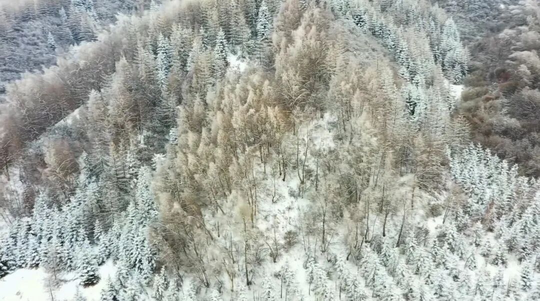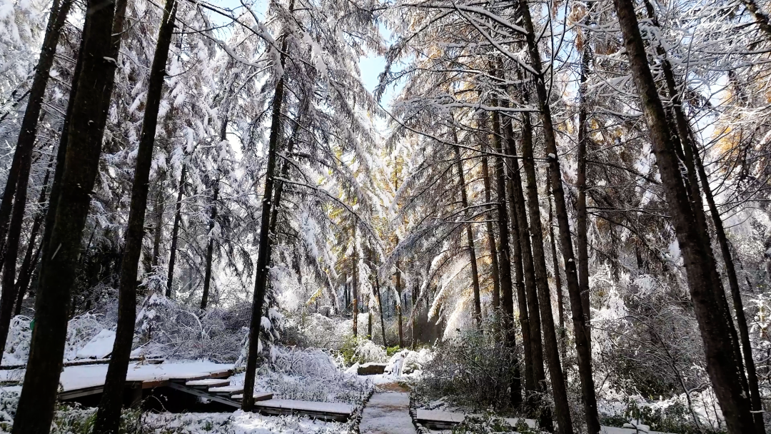 漫山松柏挂雪凝霜,雾凇晶莹,林间步道踏雪有声,空气清冽。