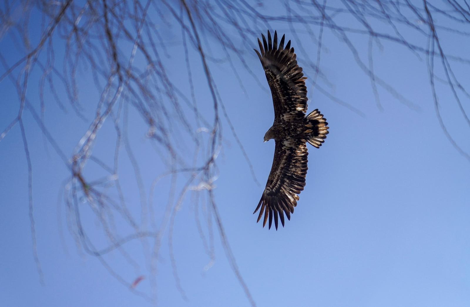 2025年12月21日,白尾海雕在关川河上空飞翔。