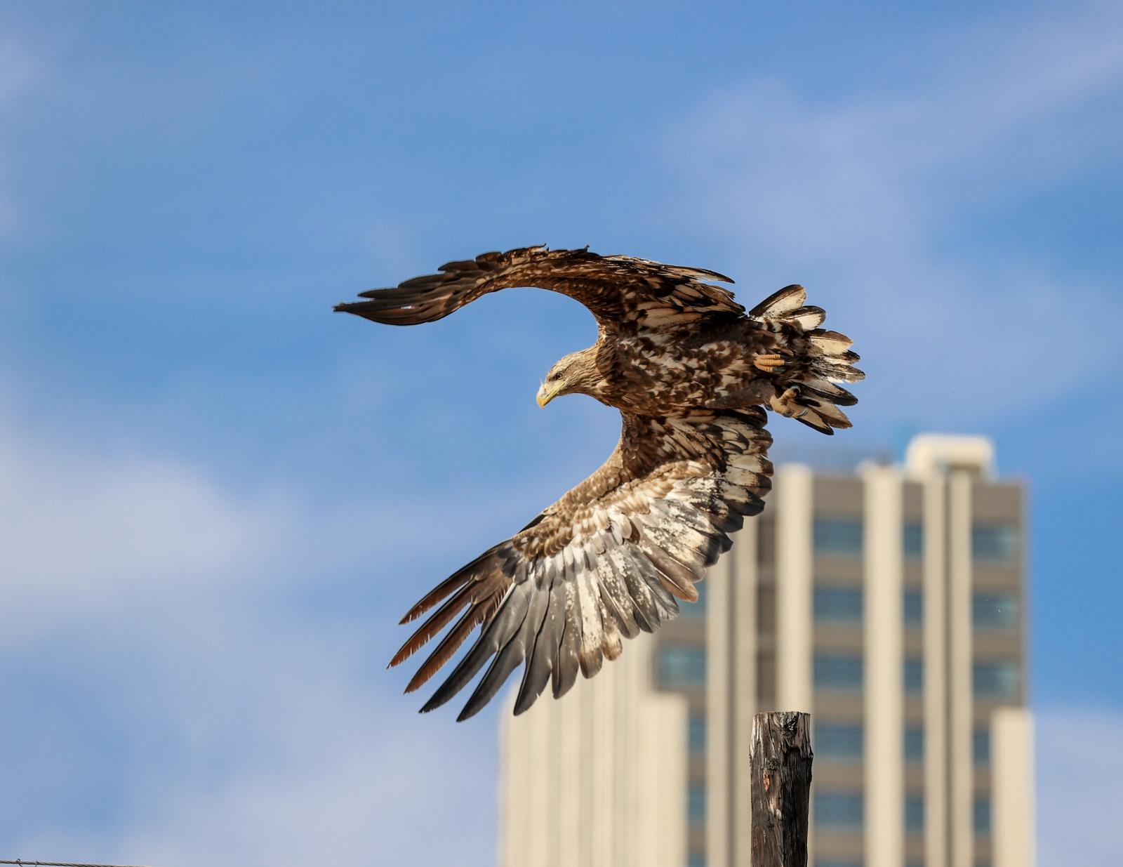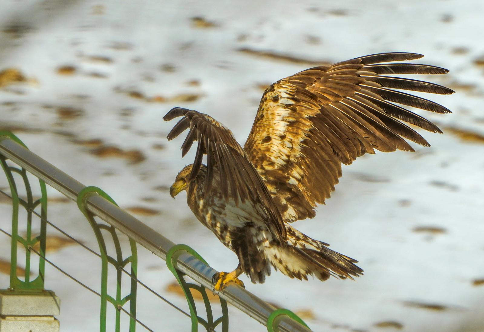 2024年12月19日,白尾海雕降落在关川河岸一护栏上。