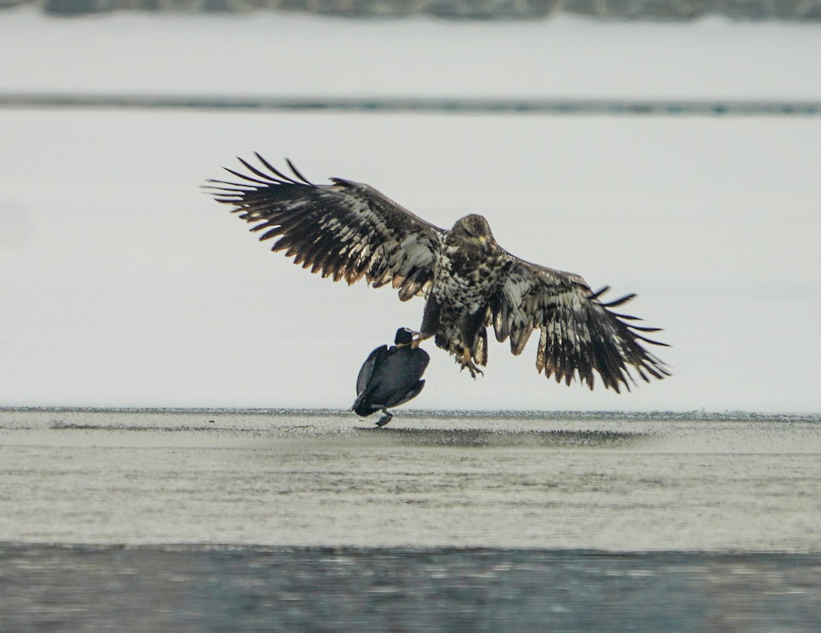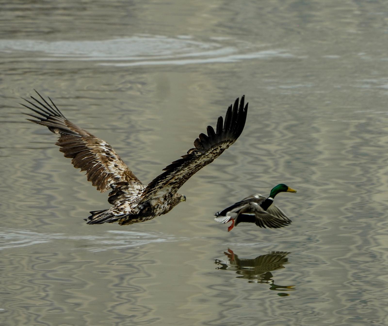 2024年12月25日,白尾海雕在关川河追逐绿头鸭。