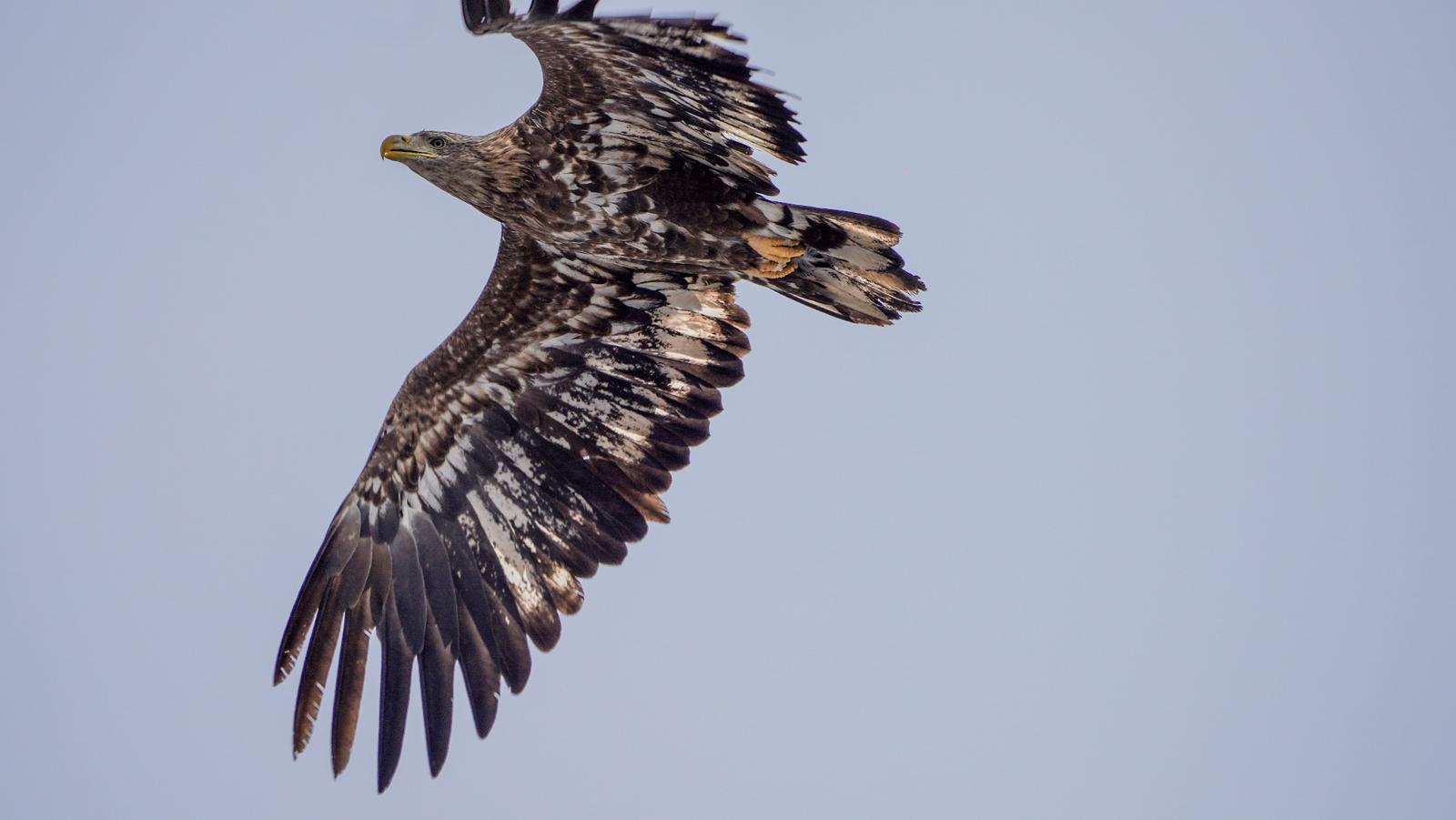 白尾海雕有“空中老虎”之称,是鹰科海雕属大型猛禽,体长约84-92厘米,翼展超2米。常栖息于沿海、湖泊、河流等水域,以鱼类为主食,也捕食水鸟和小型哺乳动物。