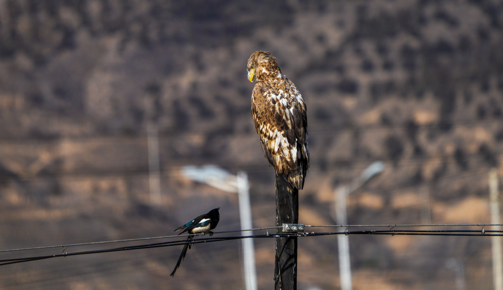 2025年12月23日,在关川河(毗邻定西湖),白尾海雕和喜鹊互动。