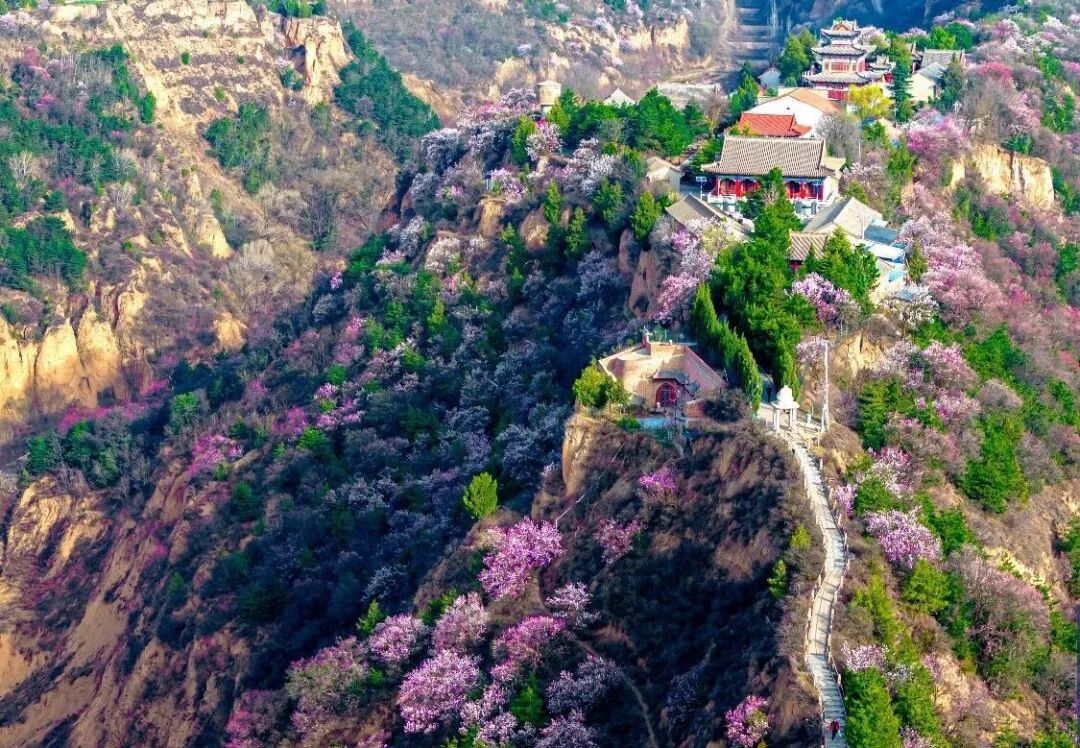 小崆峒景区的杏花盛放,山间小径、古庙檐角的樱花也将迎来花期,塬间、沟底的樱花如梦似幻。