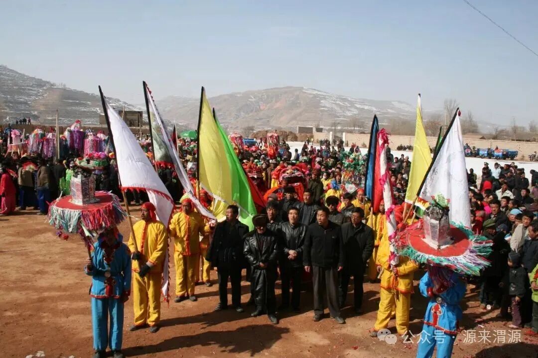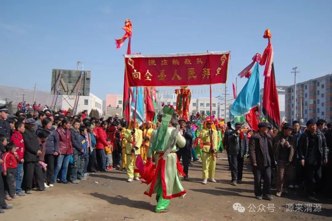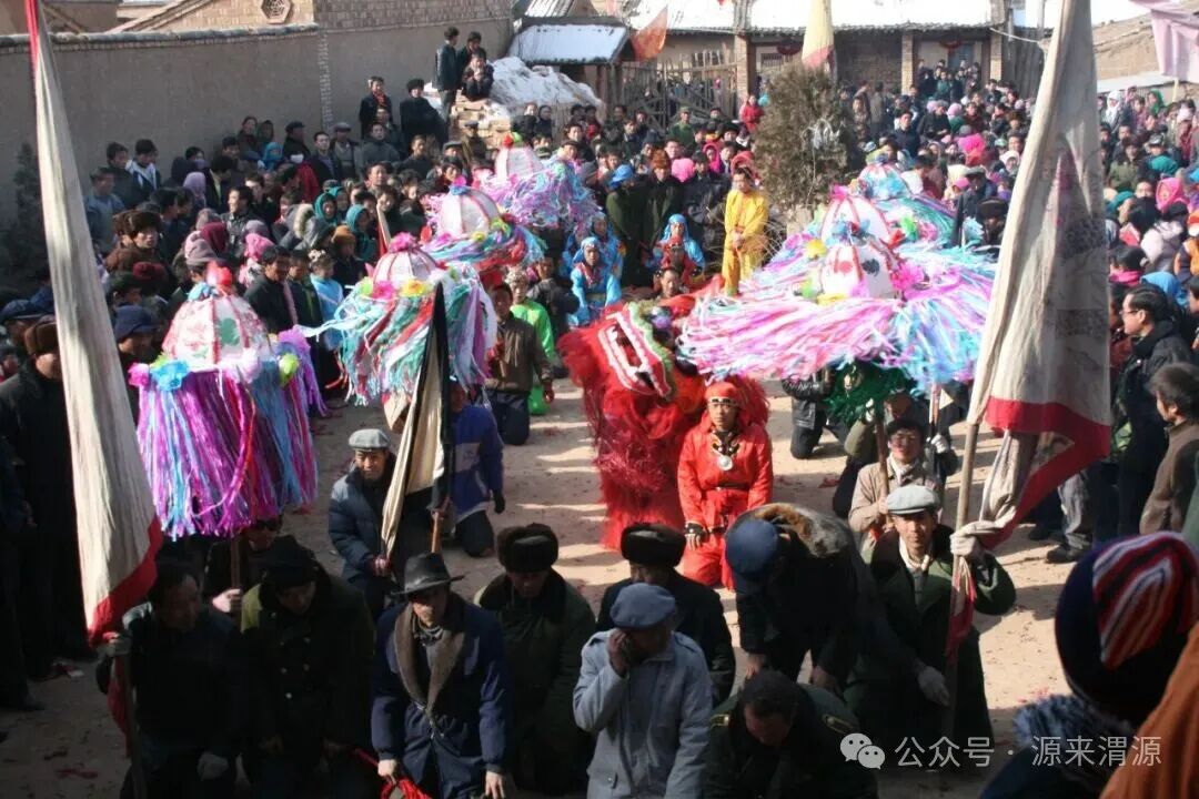 ▲2008年2月20日,渭源县社火调演,清源镇漫庄社火队,最前为持蝇刷者头人。