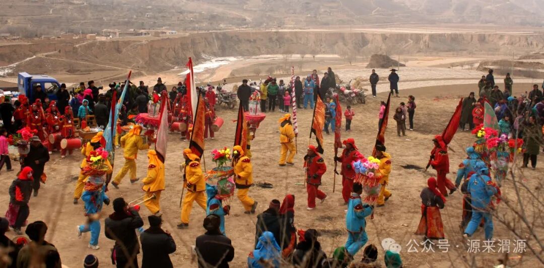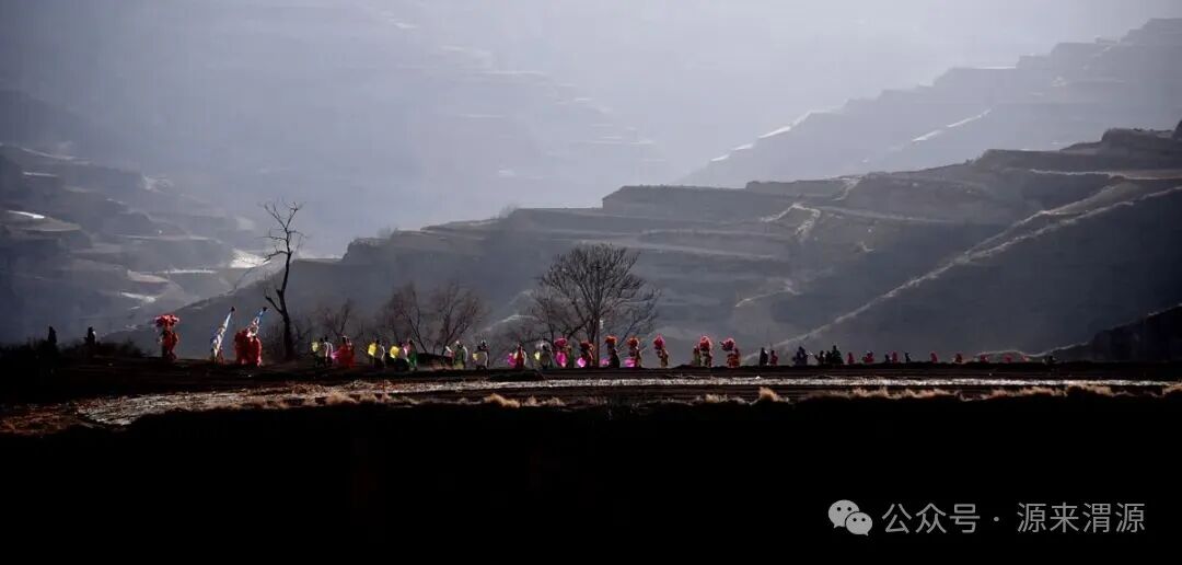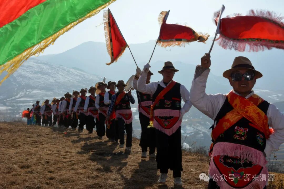 ▲2026年3月1日,渭源县新寨镇社火“山场”,姚集村、大坪村社火队行走在黄土高坡。(王纲 摄影)