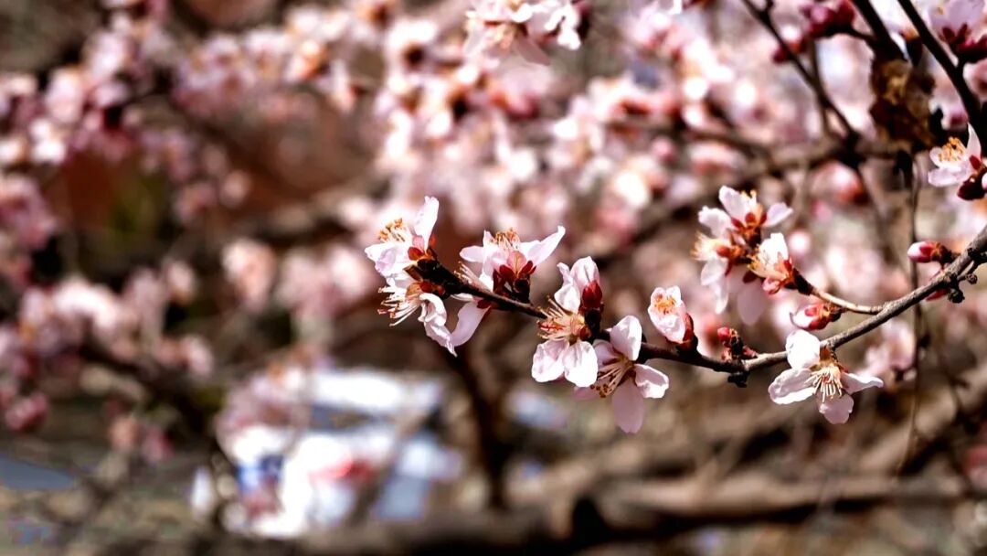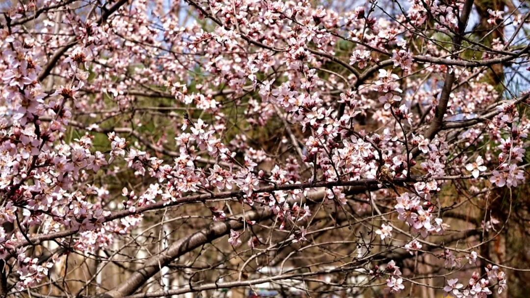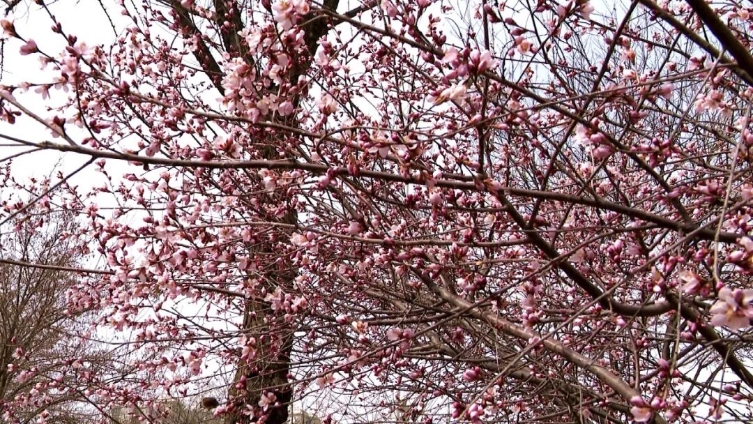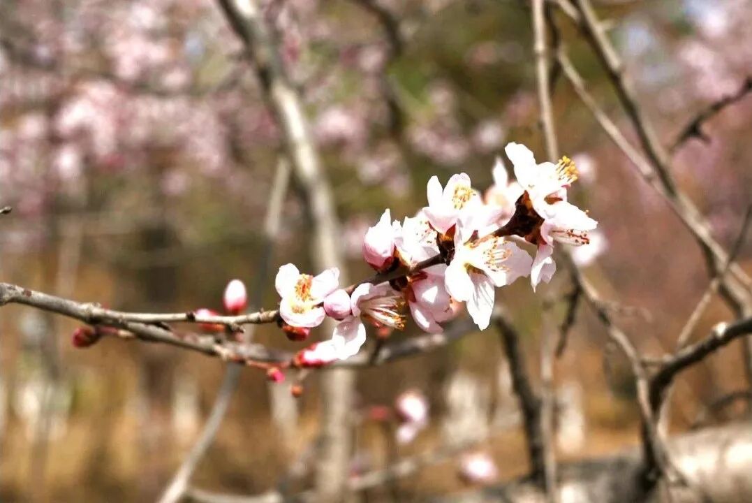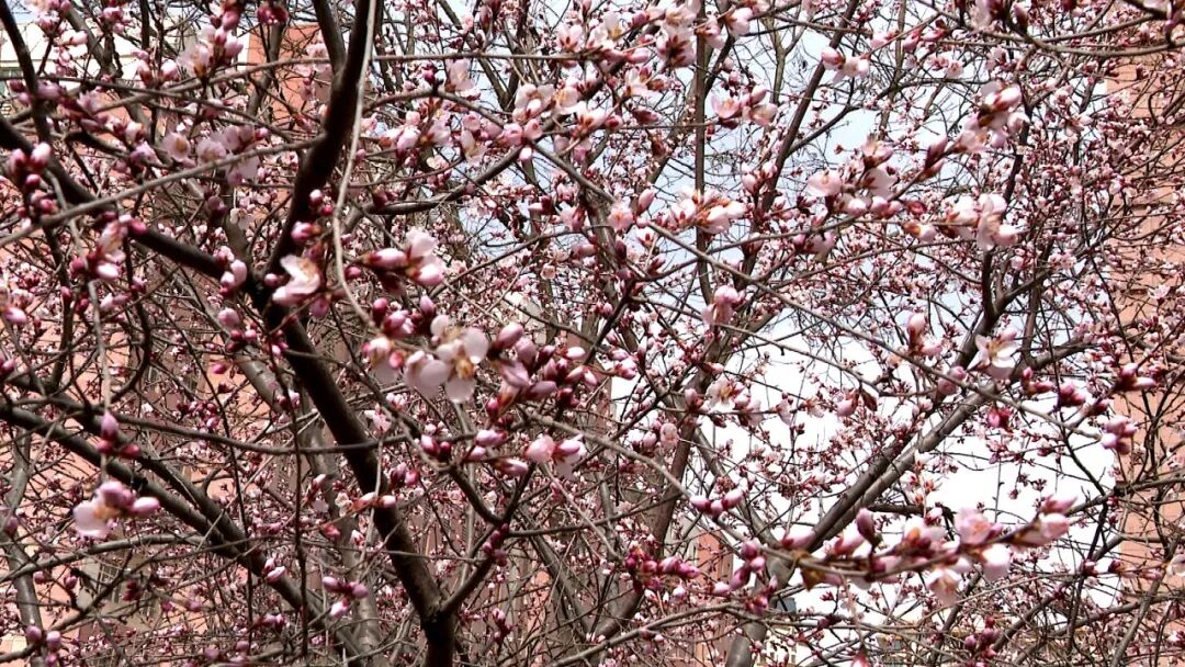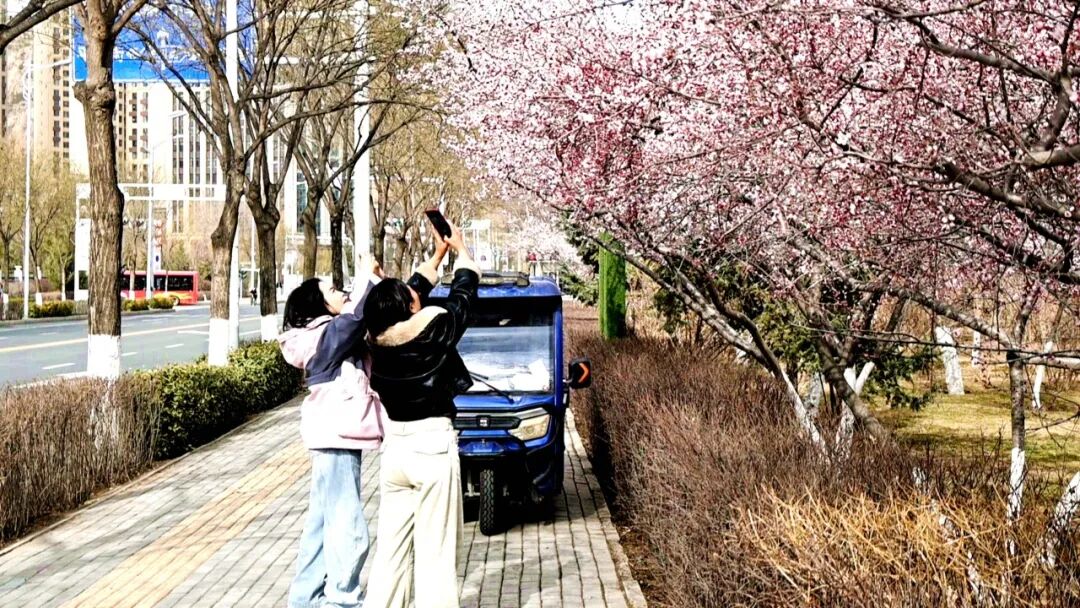 将台街边,成片山杏花迎风绽放,粉白花瓣与艳红蓓蕾交错点缀,层层叠叠,清雅动人。远远望去,沿街繁花连绵成粉色花廊,掩映着脚下的步道。往来行人纷纷驻足,或静赏春光,或举起手机定格春日美景。