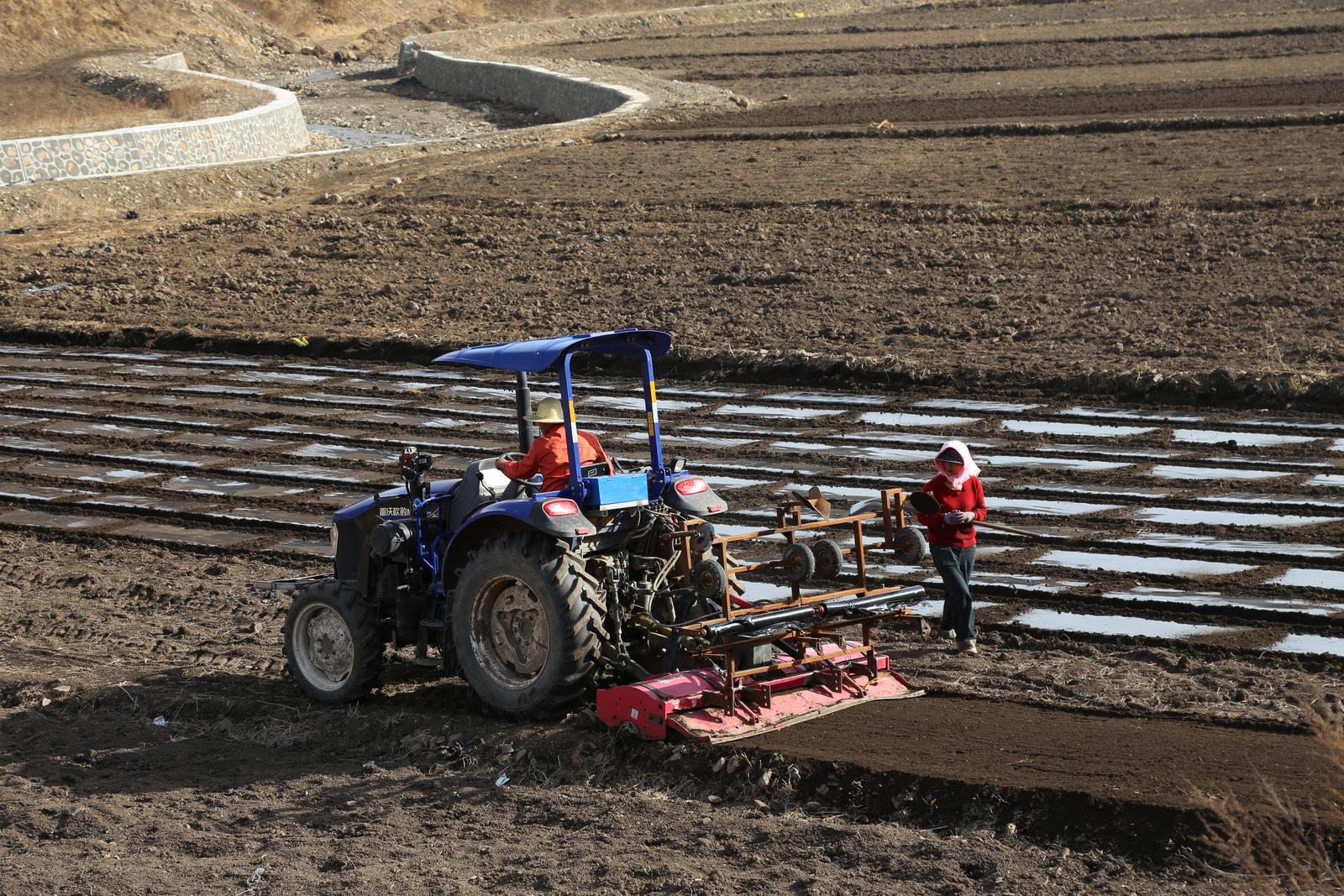 图为该乡沙地村村民正在田地用机械铺地膜