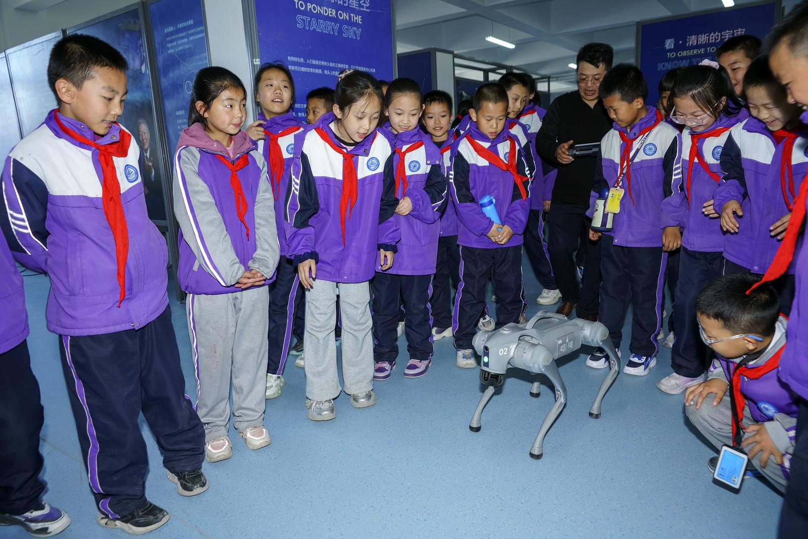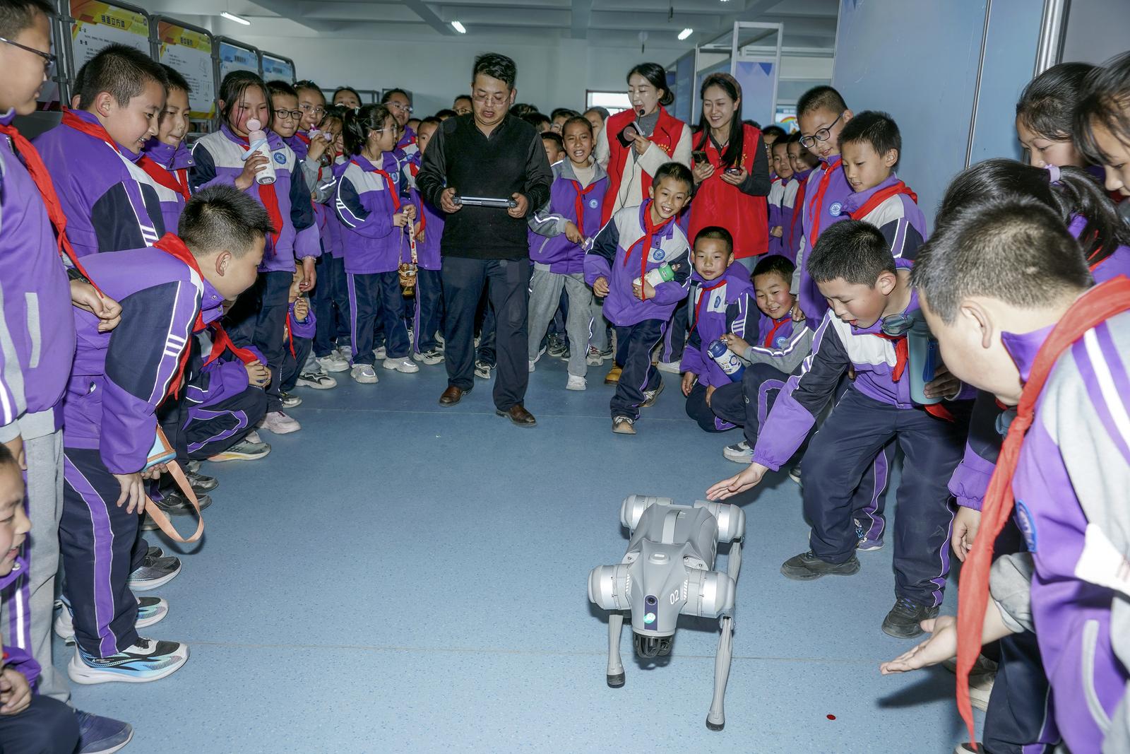科普老师操作机器狗和孩子们进行互动体验,沉浸式感受“玩中学、学中悟”的乐趣。