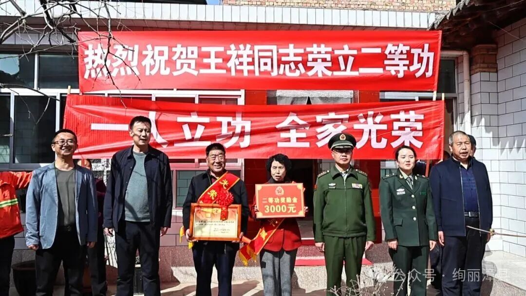队伍高举“一人当兵 全家光荣”等横幅,敲锣打鼓、声势浩荡,喜庆的氛围引来了众多乡亲驻足围观、拍手叫好。在王祥家中,工作人员为家属王益民披上“光荣军属”绶带,亲手递交二等功喜报,宣读立功嘉奖令,并送上慰问金。现场掌声雷动,邻里乡亲欢聚一堂,共沾这份来自家乡的荣耀与自豪。