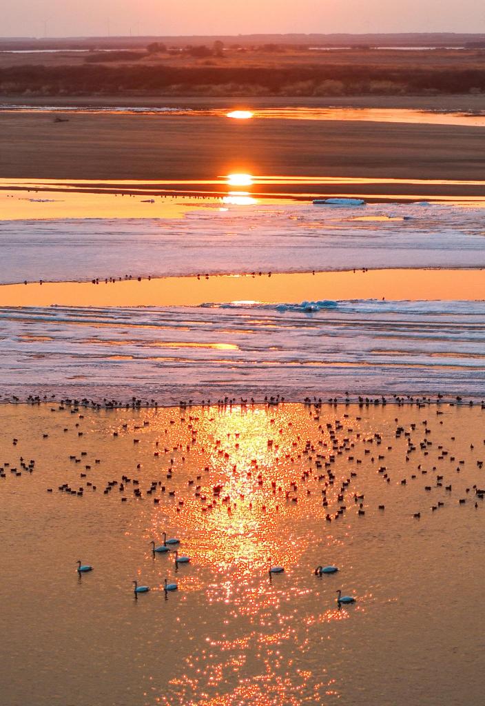 这是4月5日在松花江富锦段一处水域拍摄的候鸟(无人机照片)。新华社发(刘万平摄)