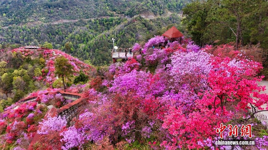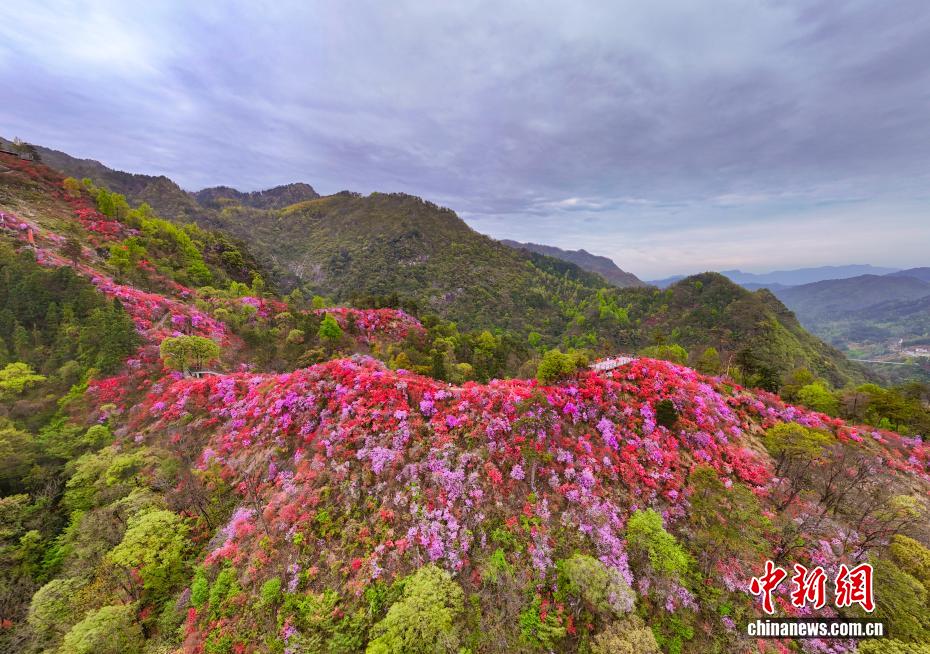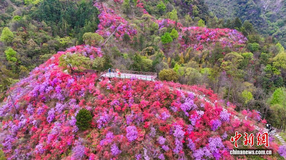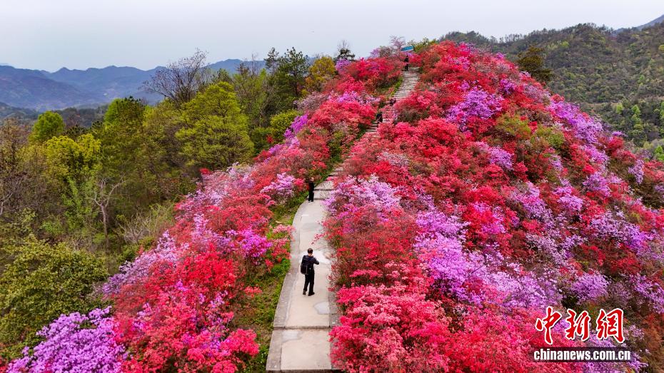 4月6日,位于大别山腹地的安徽省安庆市岳西县河图镇天峡风景区内,千亩野生高山杜鹃迎来最佳观赏期,吸引游客前来赏花度假。漫山遍野的杜鹃花海沿山脊铺展,红、粉、紫、白各色花朵竞相绽放,将大别山腹地装点成一幅绚丽的春日画卷。