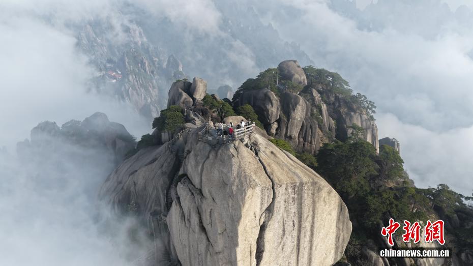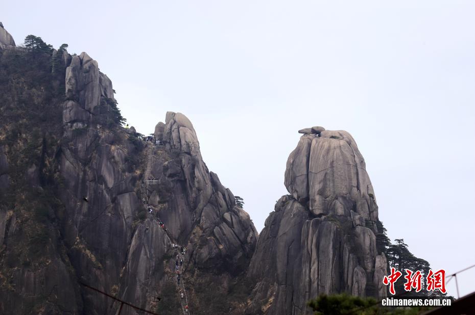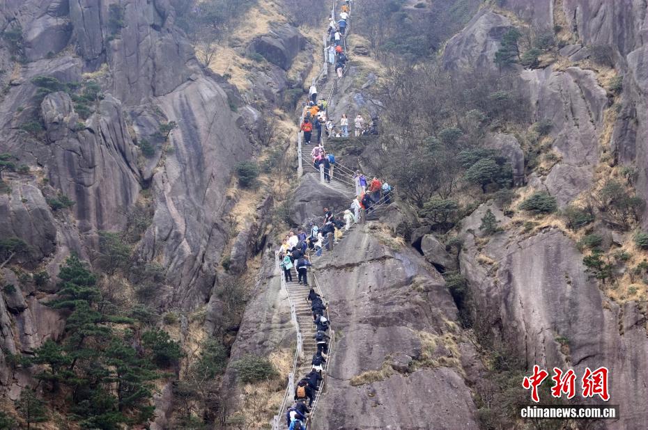 4月7日,游客游览天都峰。当日,黄山风景区三大主峰之一的天都峰,在完成冬季封闭维护后,恢复对外开放,众多游客慕名而来,有序登峰。天都峰坡陡路险,宛如“天梯”,被誉为“天上都会,群仙所都”。