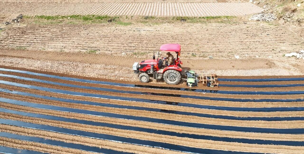 在金钟镇尖子村的连片田地里,新整理的土地松软平整,农机手正驾驶覆膜机往来作业,黑亮的地膜顺着机轮匀速铺开,严丝合缝覆在垄面上,为即将播种的当归、党参等中药材幼苗搭起了抵御春寒的“保温层”。村民们跟在农机身后补膜压边,抢抓农时做好备种工作,脸上满是对丰收的憧憬。