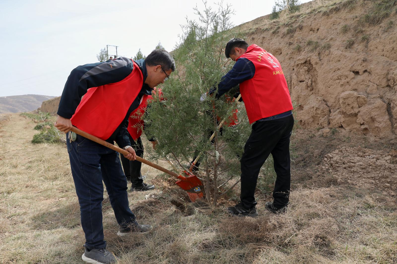 “扶直一点,再往这边挪挪”“土要踩实,水要浇透”……现场不时传来互相提醒的声音,大家动作娴熟、配合默契,将每一道工序都做得一丝不苟。所有人都化身“绿色使者”,俯身于山野之间,用双手栽下希望,用汗水浇灌生机。不多时,一株株云杉挺拔俊秀、一棵棵连翘错落有致,在和煦春风中舒展枝叶、吐露新芽,为原本略显荒芜的古雁坪山披上了一层清新嫩绿的新装,也为陇中大地增添了一抹亮眼的生态底色。看着自己亲手栽种的新苗迎风挺立,每一位参与者的脸上都洋溢着欣慰的笑容,眼中满是对生态定西、美丽家园的憧憬与期盼。