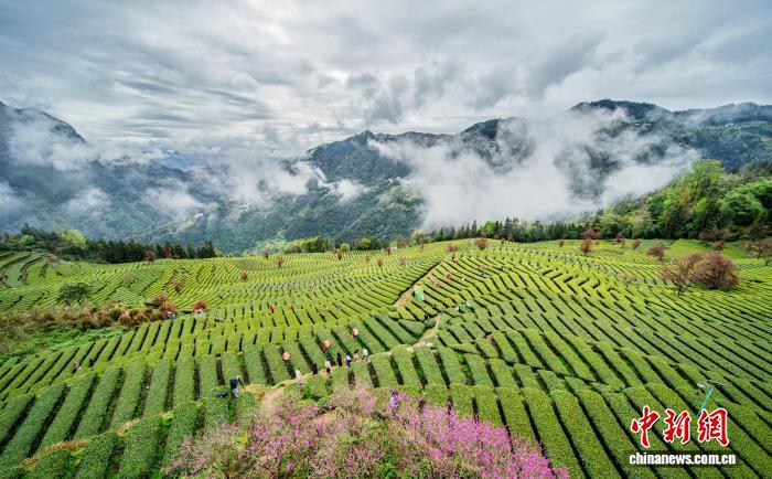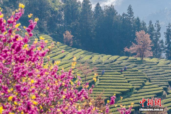 近日,在湖北省恩施市屯堡乡花枝山村,茶农在田间采摘茶叶,和远山、民居、春花、茶园相互映衬,构成一幅美丽的乡村画卷。花枝山村是恩施市首批乡村振兴试点村,目前有茶叶基地2000亩,年均亩产值超8000元。图为游客在茶园里拍照。王关政 摄